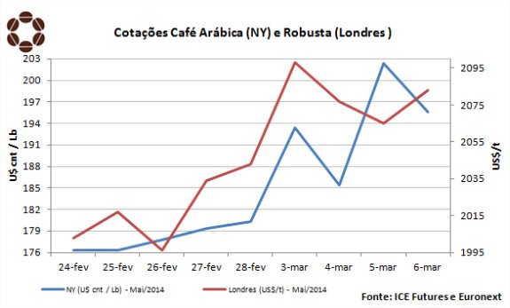 Na NYSE Liffe, os preços futuros do robusta também apresentaram alta significativa. Com a valorização do arábica em um cenário de baixos estoques nas torrefadoras, há tendência de aumento da demanda pelos grãos de conilon, mais baratos. A retração das vendas pelos produtores do Vietnã e notícias de que o clima frio e seco poderá afetar a próxima safra daquele país, conforme divulgado pela Associação de Café e Cacau (Vicofa) nesta semana, contribuíram para o movimento de alta. O fechamento de ontem do vencimento maio do contrato 409 foi de US$ 2.083 por tonelada, representando valorização de US$ 40 desde a sexta-feira passada.